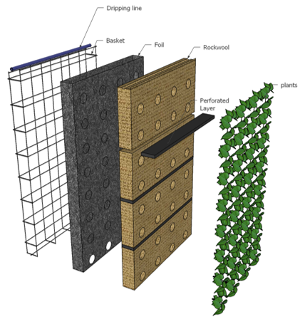 De groene gevel wordt opgebouwd met groeipanelen. Deze groeipanelen bestaan uit een korf gemaakt van gegalvaniseerd staaldraad. Het staal bevat een epoxy poedercoating en een enveloppe met HDPE bandjesweefselfolie. Het steenwolsubstraat in de korf dient als vocht- en voedingsbodem voor de beplanting.